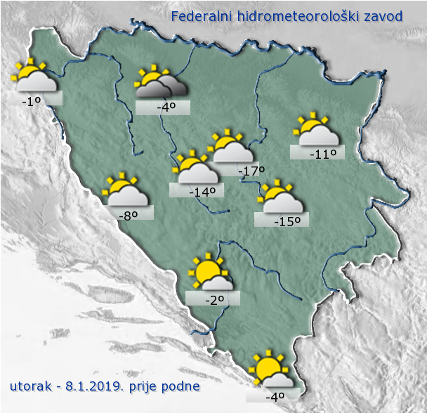 Temperature zraka u 07 sati: Sokolac -20 stupnjeva, Bjelašnica -16, Srebrenica -11, Ivan Sedlo i Sarajevo-10, Bugojno, Grude, Široki Brijeg, Tuzla, Zenica i Zvornik -8, Stolac -7, Doboj i Trebinje -6, Bijeljina i Livno -5, Gradačac i Mostar -4, Brčko, Prijedor i Sanski Most -3, Bihać i Neum -2, Banja Luka -1 stupanj. Atmosferski tlak je u Sarajevu iznosio 947 milibara, za 5 milibara je viši od normalnog i sporo opada.