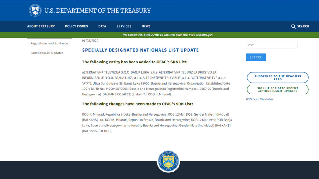 Nakon što je Ministarstvo finansija SAD-a u decembru objavilo proširenu listu sankcionisanih osoba i kompanija iz Srbije, Hrvatske, Kosova i Bugarske, a koje se povezuju s korupcijom i drugim nezakonitim aktivnostima, “crna lista” je sada proširena i na firme i pojedince iz Bosne i Hercegovine, piše Klix.ba. Prema ažuriranoj listi, sankcije Sjedinjenih Američkih Država, a koje su povezane s Bosnom i Hercegovinom, uvedene su za: – Alternativna televiziju iz Banje Luke zbog povezanosti s Miloradom Dodikom – Miloradu Dodiku, članu predsjedništva Bosne i Hercegovine.