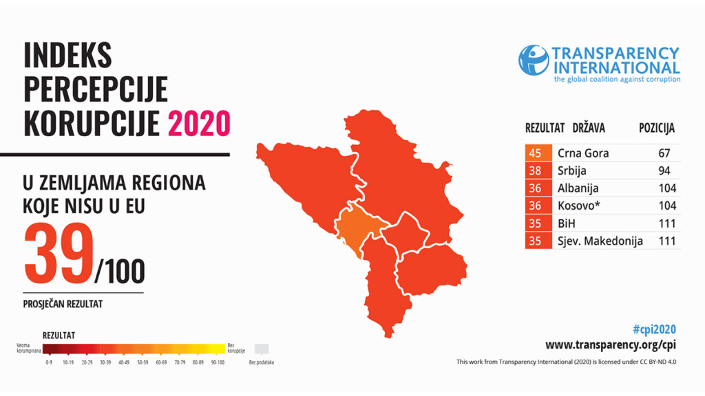 Indeks percepcije korupcije (Corruption Perception Index – CPI) Transparency International za 2020, Bosnu i Hercegovinu (BiH) svrstava među zemlje svijeta u kojima se stanje korupcije najviše pogoršava. Konstatujući pad BiH za 11 mjesta, indeks BiH rangira na 111. mjesto od 180 država, sa ocjenom 35 (skala od 0 -100), što je ujedno i najlošija ocjena od 2012., kada je BiH bila rangirana na 72. mjestu sa ocjenom 42.