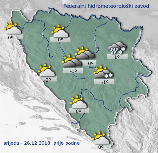 Jutros je u većem djelu Bosne bilo pretežno oblačno vrijeme. Ponegdje u planisnkim i centralnim djelovima registrovan je i slab snijeg. U Hercegovini i na jugozapadu malo do umjereno oblačno i sunčano.