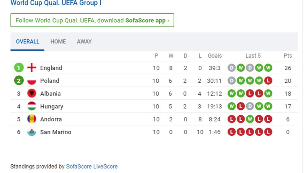 Engleska je sa 0:10 pobijedila San Marino na gostovanju i plasirala se u Katar. U prvom poluvremenu Maguire je postigao pogodak i Fabri autogol, dok je četiri gola dodao Kane. U drugom dijelu pogađali su Smith Rowe, Mings, Abraham i Saka.