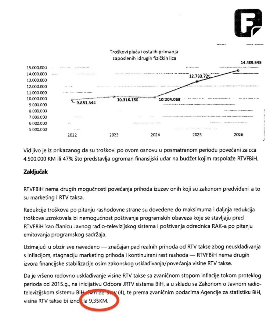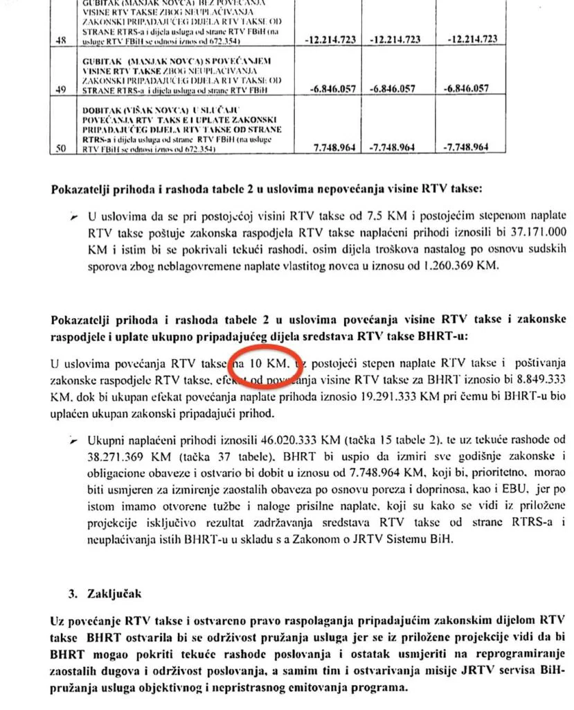 Tako je u obimnoj dokumentaciji izračun iznos prihoda za postojeću visinu RTV takse od 7,50 KM kao i uz povećanje na 10 KM.