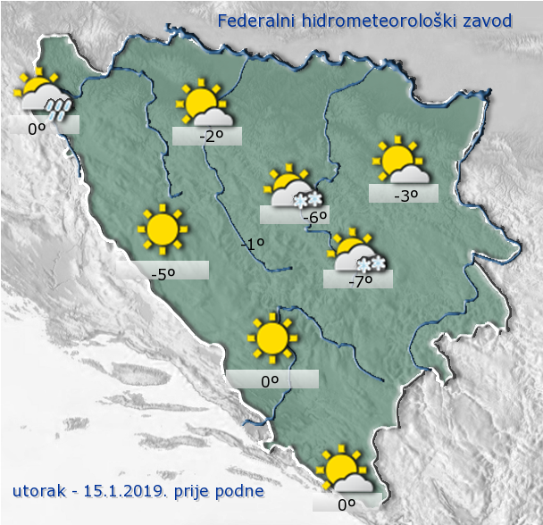Temperature zraka u 07 sati (°C): Ivan Sedlo -8; Bugojno, Sarajevo -6; Jajce, Zenica -5; Sanski Most -4; Bihać, Livno, Tuzla -2; Brčko, Gradačac -1; Grude, Široki Brijeg 1; Mostar 2; Stolac 3; Neum 5;
