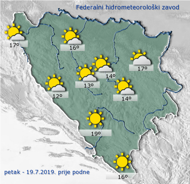 Danas se u našoj zemlji očekuje sunčano vrijeme. Tokom poslijepodneva umjeren porast naoblake u Bosni može usloviti lokalne pljuskove, ponegdje praćene grmljavinom. Vjetar slab do umjeren u Bosni sjeverni i sjeveroistočni, a u Hercegovini jugozapadni. Jutarnje temperature od 11 do 17, na jugu od 16 do 22, a dnevne od 24 do 30, na jugu i sjeveru i do 32 °C.