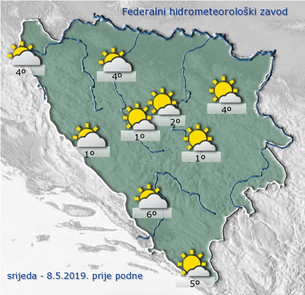 Danas u Bosni i Hercegovini prije podne pretežno sunčano vrijeme. U jutarnjim satima po kotlinama će biti dosta magle. Od sredine dana umjereno povećanje oblačnosti, a u večernjim satima jače naoblačenje sa zapada. Vjetar slab do umjerene jačine južnog i jugozapadnog smjera. Najviša dnevna temperatura zraka većinom između 16 i 21°C.