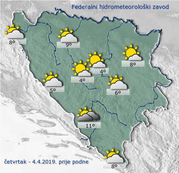 Temperature zraka u 08 sati (°C): Bjelašnica -2; Sokolac 2; Bugojno, Sanski Most 4; Prijedor 6; Banja Luka, Zenica, Zvornik 7; Ivan Sedlo, Jajce 8; Livno, Sarajevo 9; Brčko, Doboj, Gradačac, Tuzla 10; Drvar, Grude, Široki Brijeg, Trebinje 12; Mostar 14; Bihać, Stolac 15; Neum 16;