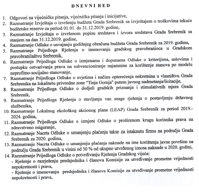 NaslovnicaVIJESTISREBRENIK U subotu sjednica Gradskog vijeća Srebrenik By admin 1 Juna, 2020 0 528 FacebookViberWhatsAppEmailTwitterPrintCopy URL 5. sjednica Gradskog vijeća Srebrenik, kako je najavljeno, trebala bi se održati 06.06.2020. godine (subota) sa početkom u 10,00 sati u Plavoj sali Doma kulture u Srebreniku. Za ovu sjednicu je predviđen obiman dnevni red: Dijeliti FacebookViberWhatsAppEmailTwitterPrintCopy URL Prethodni članakU protekla 24 sata bez novih slučajeva COVID-19 u FBiHNaredni članakTakmičarska komisija NS BiH predložila: Premijer liga se prekida, Sarajevo prvak admin VIJESTI BIH I SVIJET Važno obavještenje za bh. radnike iz Njemačke: Bez ovih dokumenata nema novčane naknade SREBRENIK Saradnja Grada Srebrenika s Institutom Yunus Emre Sarajevo: Organizovan program za najmlađe BIH I SVIJET Radari danas na brojnim lokacijama u TK SERVISNE INFORMACIJE SERVISNE INFORMACIJE Servisne informacije: Vatrogasci ugasili požar u stanu SERVISNE INFORMACIJE U četvrtak i petak planska isključenja električne energije SERVISNE INFORMACIJE Servisne informacije: Danas planska isključenja električne energije SERVISNE INFORMACIJE Sutra bez struje nekoliko naselja u Srebreniku SERVISNE INFORMACIJE Servisne informacije: U UKC-u Tuzla rođeno šesnaest beba Učitati više SREBRENIK VIJESTI SREBRENIK Saradnja Grada Srebrenika s Institutom Yunus Emre Sarajevo: Organizovan program za najmlađe SREBRENIK Uz podršku Vlade FBIH: Milion i 450 hiljada KM za projekte u Srebreniku SREBRENIK Poziv za učešće u panel diskusiji “Psihološka podrška u policijskim upravama – nužnost, a ne opcija” u Srebreniku SREBRENIK Održane javne rasprave u svim mjesnim područjima po pitanju Nacrta Budžeta Grada Srebrenika Učitati više