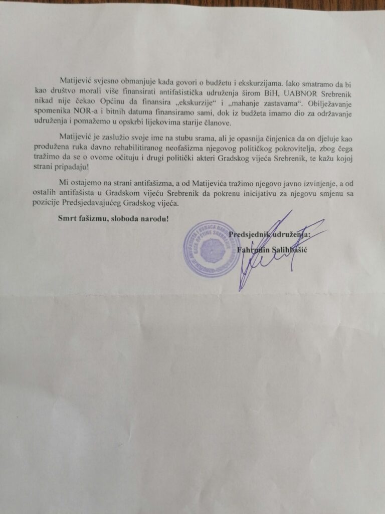 NaslovnicaVIJESTISREBRENIK Udruženje antifašista i boraca NOR-a,demant na izjave Predsjedavajućeg Gradskog vijeća Srebrenik By admin 12 Februara, 2021 0 73 FacebookViberWhatsAppEmailXPrintCopy URL Dijeliti FacebookViberWhatsAppEmailXPrintCopy URL Prethodni članakZaboravljen u domovini, Alan Ford ima kultni status u bivšoj JugoslavijiNaredni članakU Hrvatskoj izdat narandžasti i crveni meteoalarm admin VIJESTI BIH I SVIJET U brojnim školama U HNK zaprimljene dojave o postavljenim eksplozivnim napravama BIH I SVIJET Sud pustio osumnjičenog za pedofiliju iz Brčkog na slobodu: Policija ga ponovo uhapsila BIH I SVIJET Predložena mjera pritvora za Armina Kamarića (36) iz Gračanice SERVISNE INFORMACIJE SERVISNE INFORMACIJE Servisne informacije: Danas planska isključenja električne energije SERVISNE INFORMACIJE Servisne informacije: I danas zbog neophodnih radova prekidi u isporuci vode SERVISNE INFORMACIJE Servisne informacije: Danas planska isključenja električne energije BIH I SVIJET U četvrtak planska isključenja električne energije SERVISNE INFORMACIJE Servisne informacije: Od sutra prekidi u isporuci vode zbog izvođenja neophodnih radova Učitati više SREBRENIK VIJESTI SERVISNE INFORMACIJE Servisne informacije: Danas planska isključenja električne energije SREBRENIK Asfaltiranje lokalnog puta u naselju Gudići SREBRENIK Gradi se rezervoar u MZ Ahmići – Pirage SREBRENIK Izgradnja vodovodnog sistema na mjesnom području Tinja Učitati više