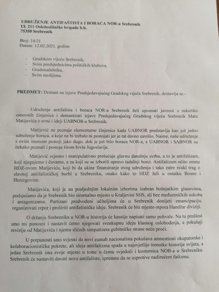 NaslovnicaVIJESTISREBRENIK Udruženje antifašista i boraca NOR-a,demant na izjave Predsjedavajućeg Gradskog vijeća Srebrenik By admin 12 Februara, 2021 0 71 FacebookViberWhatsAppEmailTwitterPrintCopy URL Dijeliti FacebookViberWhatsAppEmailTwitterPrintCopy URL Prethodni članakZaboravljen u domovini, Alan Ford ima kultni status u bivšoj JugoslavijiNaredni članakU Hrvatskoj izdat narandžasti i crveni meteoalarm admin VIJESTI BIH I SVIJET Produžen pritvor Mirsadu Bakaloviću i Zinaidi Razić Halilović BIH I SVIJET Evo kolika je bila prosječna plata u FBiH u novembru BIH I SVIJET U toku vremenskih nepogoda otkolonjeno više od 2300 kvarova na mreži i objektima SERVISNE INFORMACIJE SERVISNE INFORMACIJE Servisne informacije: Voda s pojedinih lokalnih vodovoda nije za piće SERVISNE INFORMACIJE Servisne informacije: TK bogatiji za deset beba SERVISNE INFORMACIJE Servisne informacije: Rođeno sedam beba u UKC-u Tuzla SERVISNE INFORMACIJE Servisne informacije: Danas akcija dobrovoljnog darivanja krvi SERVISNE INFORMACIJE Servisne informacije: U saobraćajnoj nezgodi povrijeđene četiri osobe Učitati više SREBRENIK VIJESTI SERVISNE INFORMACIJE Servisne informacije: Voda s pojedinih lokalnih vodovoda nije za piće SREBRENIK Danas defile vozila u Srebreniku povodom obilježavanja Dana vozača i automehaničara SERVISNE INFORMACIJE Servisne informacije: TK bogatiji za deset beba SREBRENIK U Srebreniku održana promocija knjige “Sehara uspomena” Učitati više