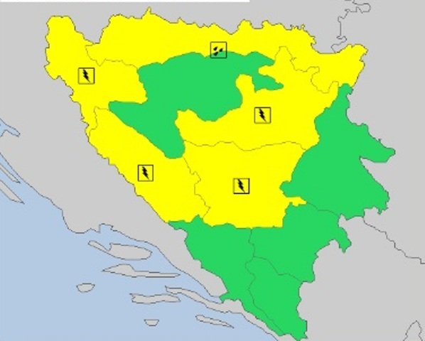 Evropski meteorološki servis Meteoalarm za danas i sutra je aktivirao žuti meteoalarm za teritoriju Bosne i Hercegovine. Meteoalarm je upaljen zbog grmljavine i obilnijih padavina.