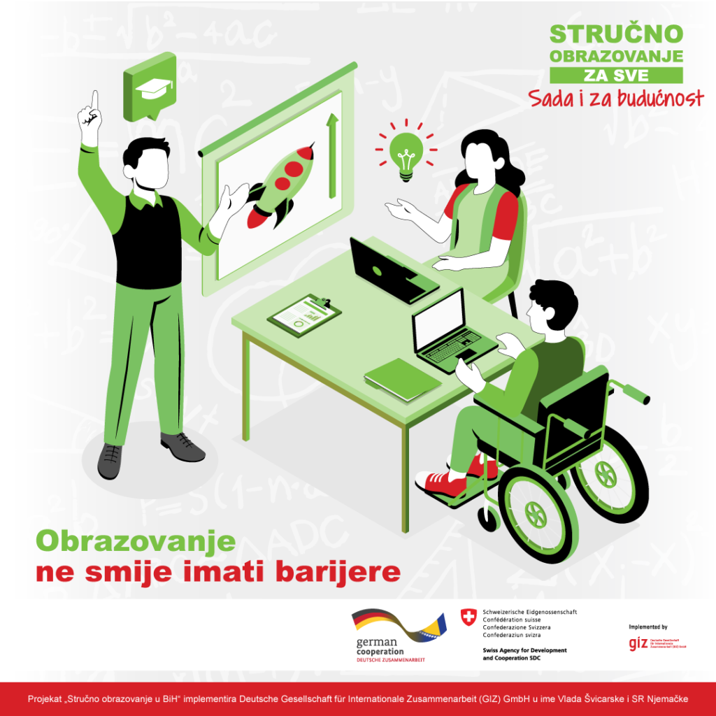 Projekat „Stručno obrazovanje u BiH“ kojeg provodi Deutsche Gesellschaft für Internationale Zusammenarbeit (GIZ) GmbH u ime Vlada Švicarske i SR Njemačke intenzivno radi na jačanju socijalne inkluzije zajedno sa projektnim partnerima i sa partnerskim školama u BiH. Tokom početka ove godine godine održani su online treninzi na temu socijalne inkluzije i inkluzivnog obrazovanja u kontekstu srednjeg stručnog obrazovanja u BiH. Učesnice i učesnici su imali priliku čuti više o osnovnim terminima iz oblasti socijalne inkluzije i inkluzivnog obrazovanja, kao i dobiti pregled osnovnih zakonskih i podzakonskih akata iz oblasti inkluzivnog obrazovanja u Bosni i Hercegovini.
