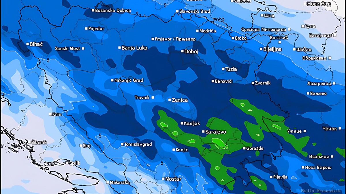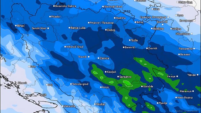 Naoblačenje, u nastavku dana i večeras kiša, na planinama snijeg koji se do sutra ujutru prodorom osjetno hladnijeg vazduha u dijelovima centralne, istočne, jugoistočne Bosne te istočne Hercegovine moze spustiti i na samo 700mnv.