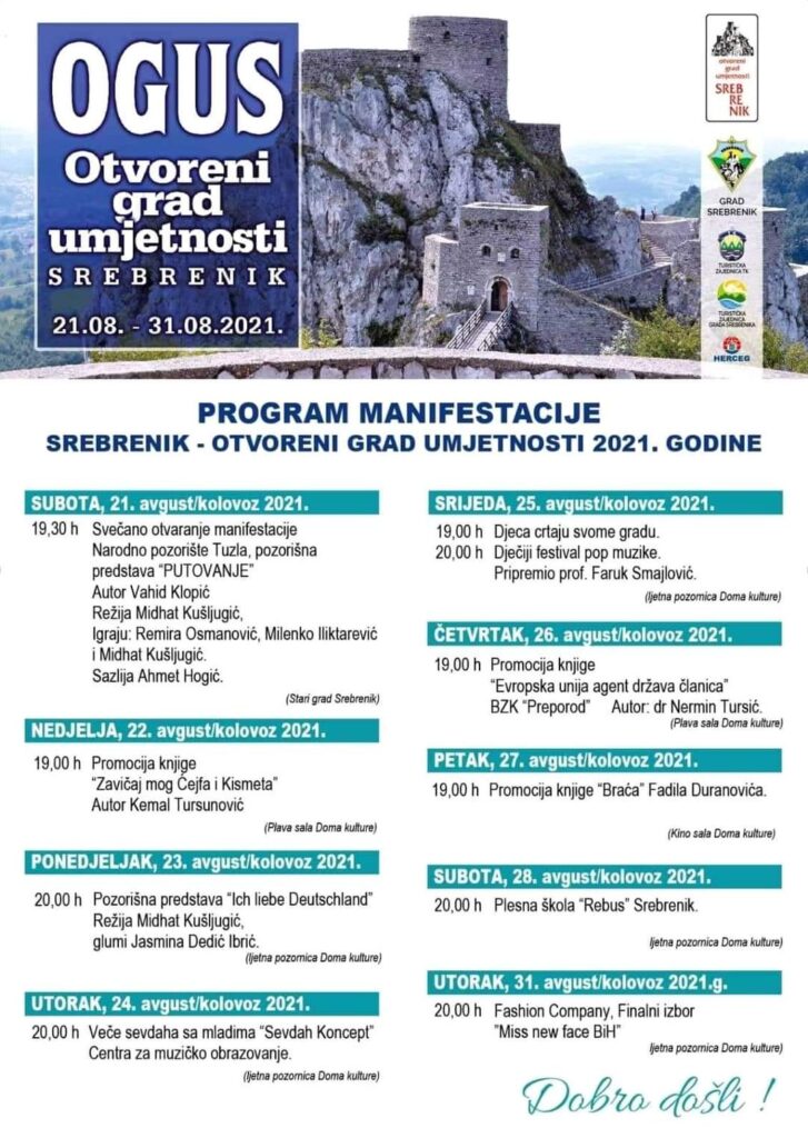 Ovogodišnje tradicionalna manifestacija “Srebrenik – otvoreni grad umjetnosti” biće svečano otvorena na zidinama Starog grada Srebrenika danas u 19:30h. Manifestacija će biti otvorena pozorišnom predstavom “Putovanje”, u izvedbi glumaca Narodnog pozorišta Tuzla.