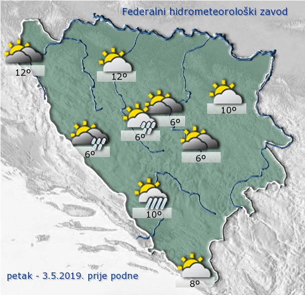 Danas u Bosni i Hercegovini pretežno oblačno vrijeme. U drugoj polovini dana lokalno će biti pljuskova i slabe grmljavine. Vjetar slab do umjerene jačine južnog i jugozapadnog smjera. Najviša dnevna temperatura zraka između 16 i 22°C. U Sarajevu djelomično vedro. Najviša dnevna temperatura oko 18°C.