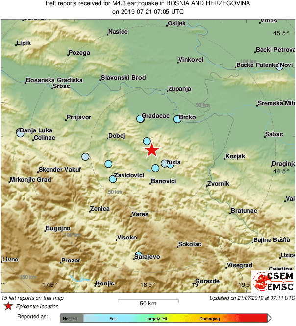Kako javlja Evromediteranski seizmološki centar (EMSC), potres je bio na dubini od dva kilometara, a stanovnici Tuzle su javili da su se zgrade tresle 5-10 sekundi.